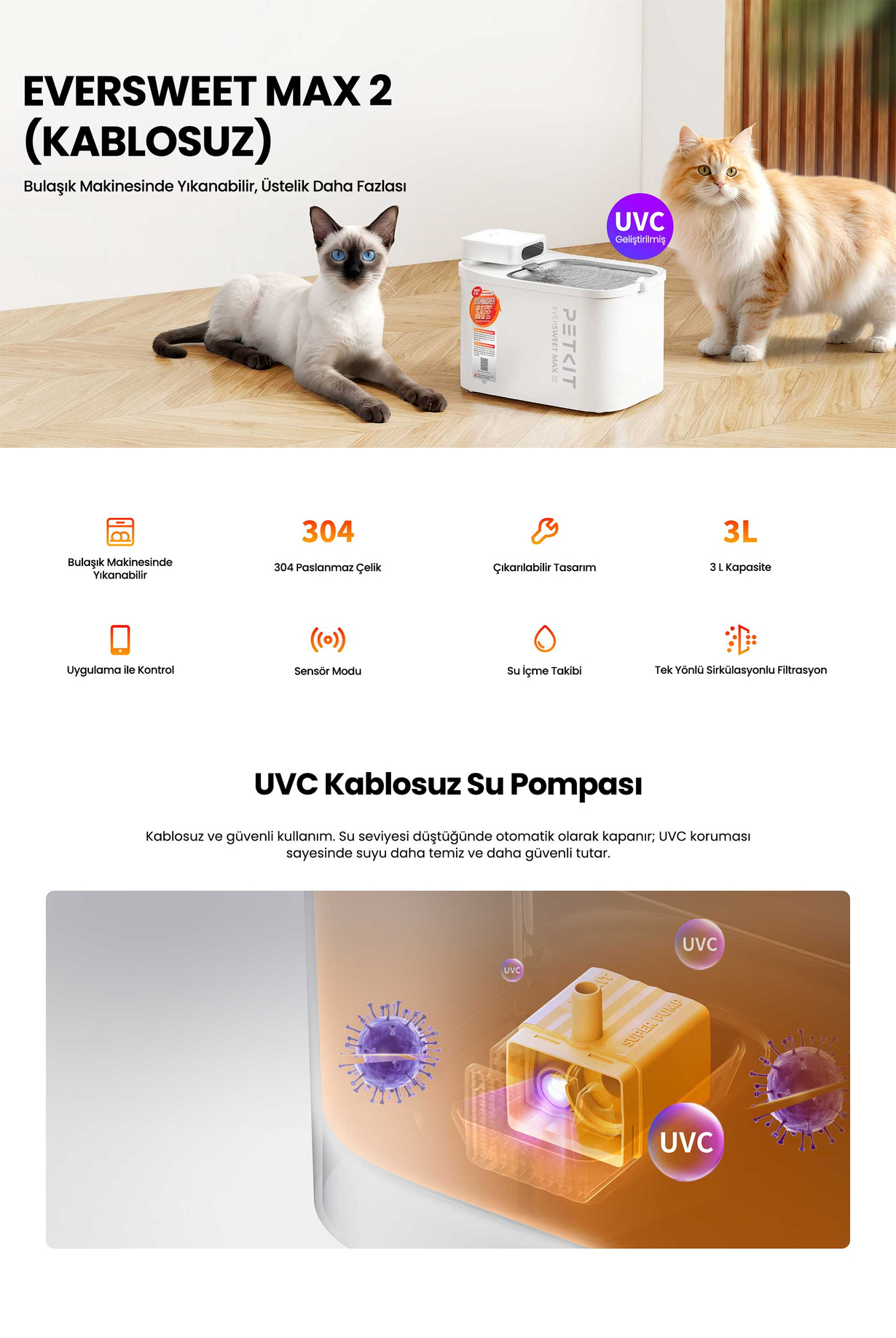 Temizlik Uyarısı: Ana gövde ve çelik tepsi bulaşık makinesinde yıkanabilir. Ancak Kontrol Modülü, Taban, Filtre ve UVC Pompanın bulaşık makinesinde yıkanması kesinlikle önerilmez.