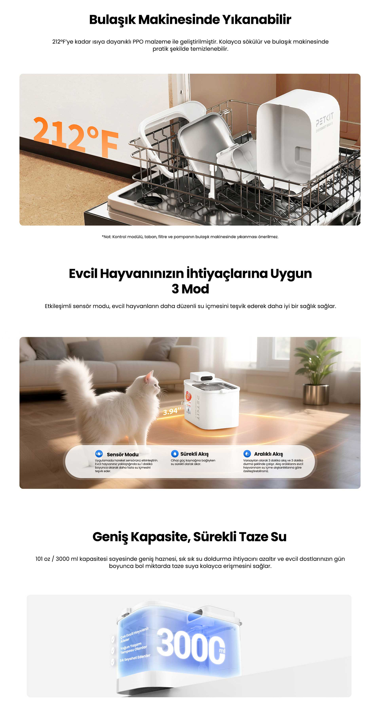 | Sensör Modu | Evcil hayvanınız cihaza yaklaştığında hareket sensörü devreye girer ve 1 dakika boyunca su akar. İlgiyi artırır ve pil tasarrufu sağlar. |