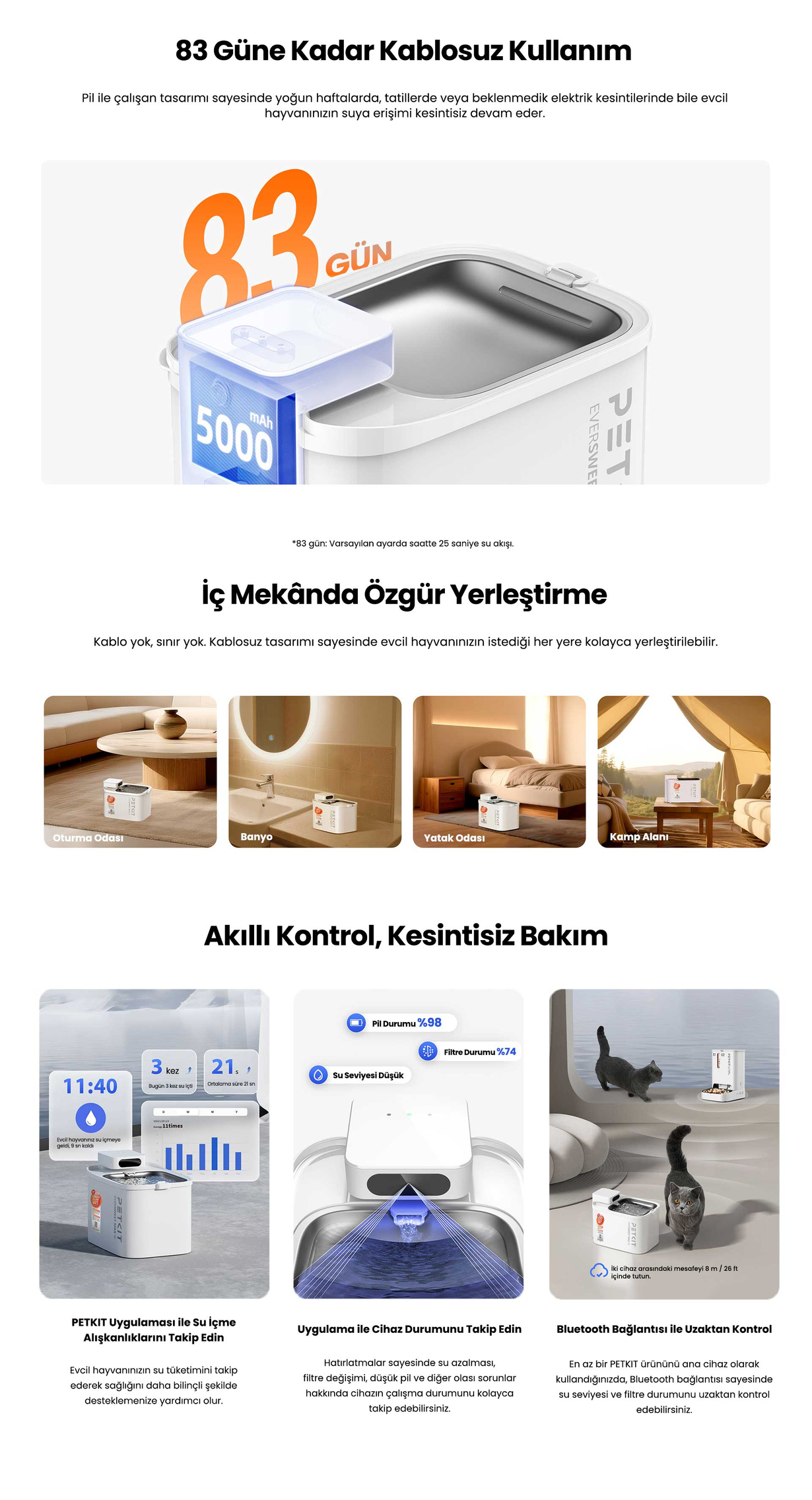 Bluetooth üzerinden PETKIT uygulamasına bağlanarak cihazı uzaktan yönetin. Evcil hayvanınızın su içme alışkanlıklarını grafiklerle takip edebilir; su azalması, filtre değişimi ve düşük pil gibi durumlarda anlık bildirimler alabilirsiniz.