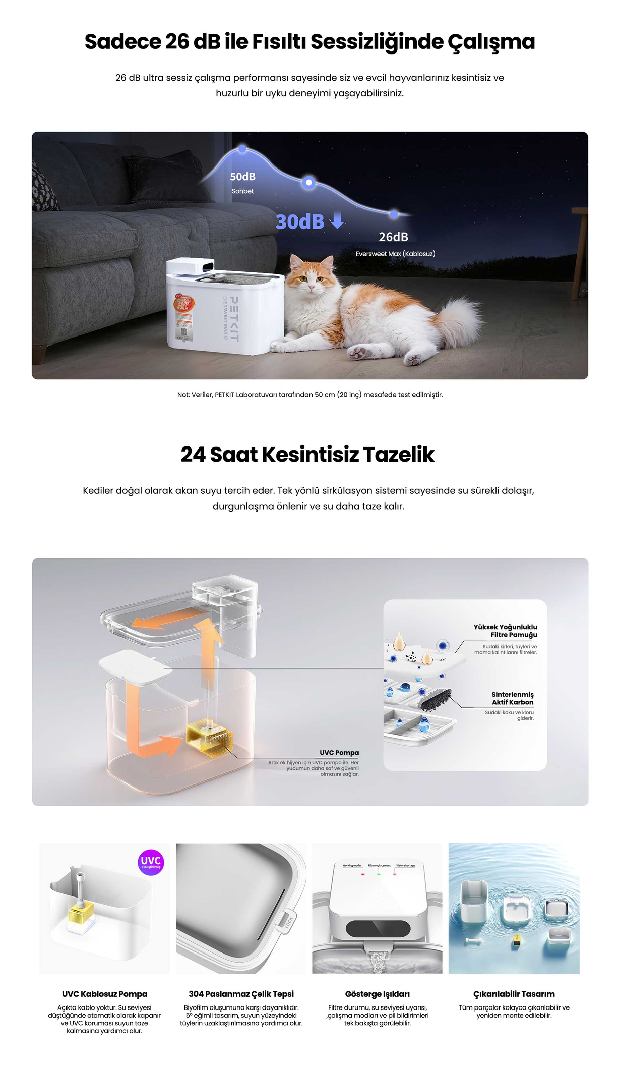 Hijyen: Durgun kaplardaki sularda hızla bakteri ürer. UVC filtreli sistemler suyu 7/24 temiz tutar.