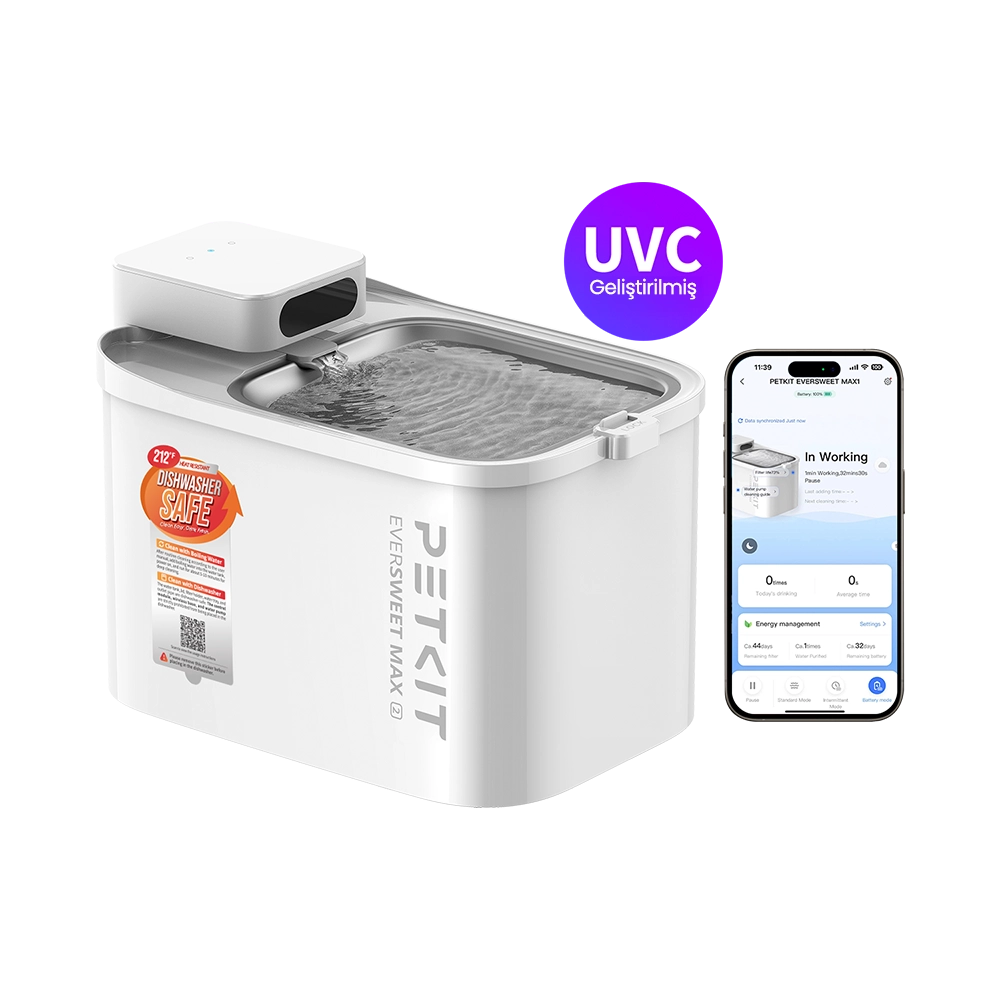 Tamamen kablosuz tasarımı sayesinde evinizin dilediğiniz köşesine yerleştirebileceğiniz PETKIT Eversweet Max 2, 83 güne varan devasa şarj ömrü, UVC sterilizasyon pompası ve 304 paslanmaz çelik tepsisiyle 24 saat kesintisiz tazelik sunar.