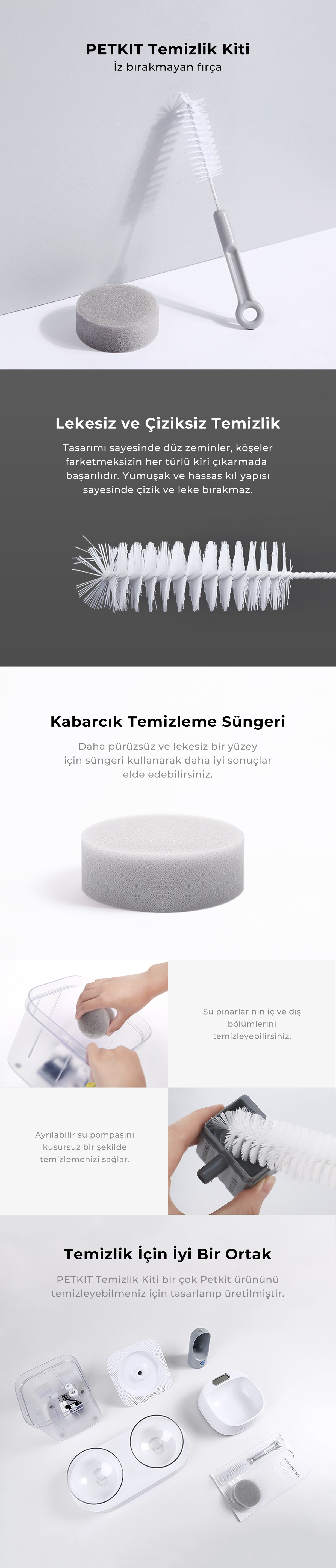 PETKIT Temizlik Seti Gri, özellikle markanın popüler Eversweet Su Pınarı modelleri ve diğer akıllı cihazlarının en hassas noktalarına ulaşmak üzere özel olarak tasarlanmış bir dizi araç içerir. Setin her bir parçası, belirli bir temizlik zorluğunu ortadan kaldırmak için bilimsel bir hassasiyetle geliştirilmiştir.